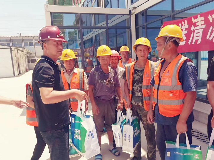曾峰详细了解了施工进展情况,并与广大职工交流生产生活情况,为高温下仍坚守在一线的工人们送去毛巾、人丹、十滴水及洗漱用品等防暑降温物资,感谢一线职工为合肥建设作出的贡献,并叮嘱工人们要根据天气情况,适当调整户外作业时间,做好防暑降温工作,做到劳逸结合。